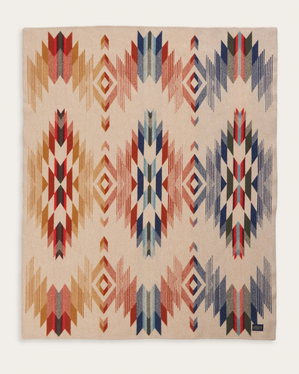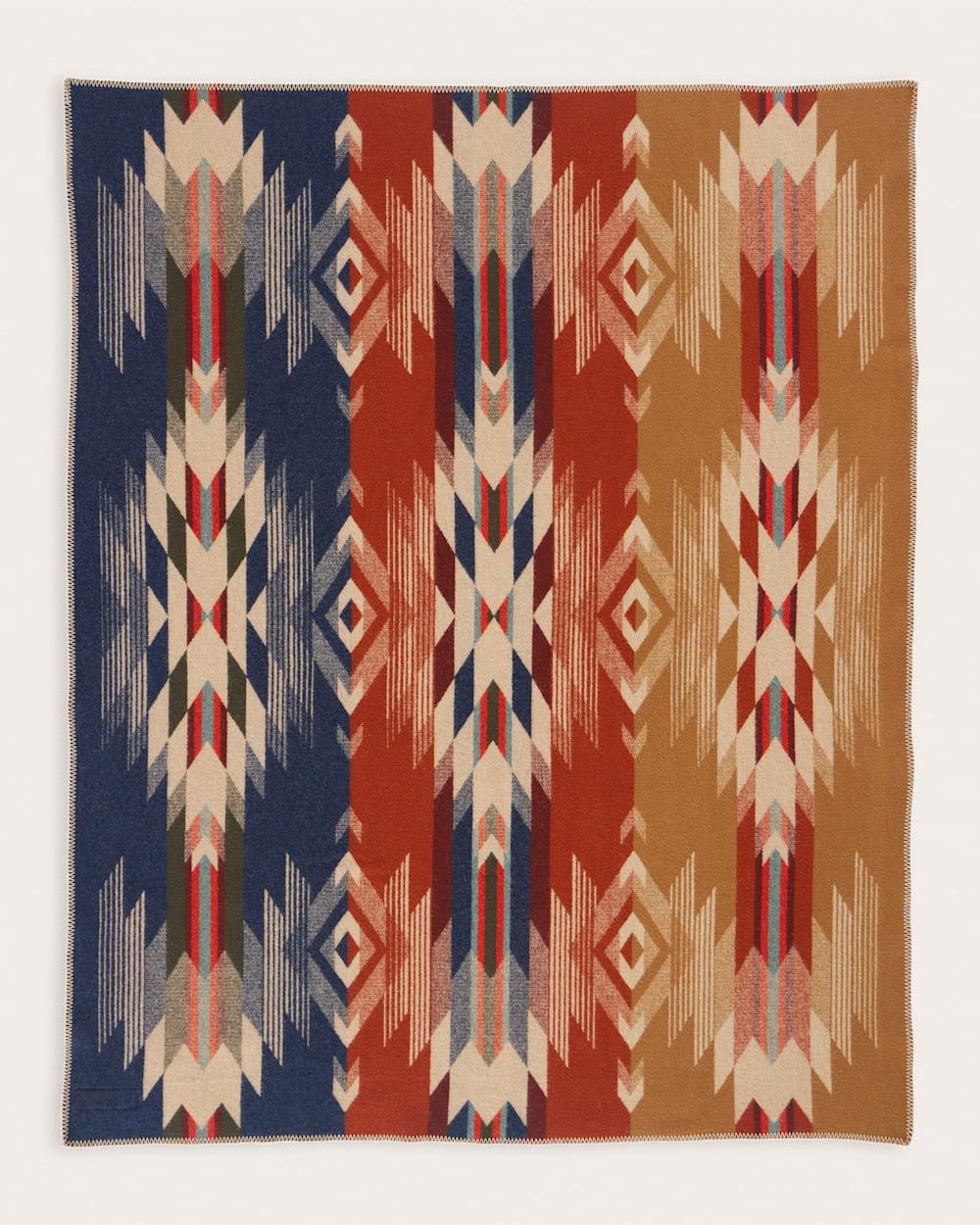 Showcasing a vibrant geometric pattern, the Wyeth Falls Throw brings a splash of color and warmth to any room. Woven in Pendleton's Pacific Northwest mills, it's both a functional blanket and a decorative piece.