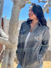 Celebrate 100 years of Pendleton shirts with this new style! Button front, utility chest pockets.  Made in 100% Umatilla Wool with contract Harding pattern at collar, back yoke, cuffs and pockets.