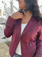 Stand out with this classic cabernet red faux suede jacket, featuring zipper details and a lapel notch collar. Its rich texture and contemporary design make it adaptable, whether you're dressing up for an evening or adding a chic layer to your weekend look. This timeless piece will instantly enhance any outfit.