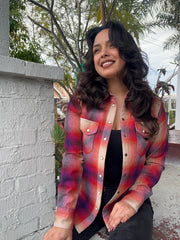 A Western-style women's shirt in our machine-washable Umatilla wool, sourced from Oregon ranchers and woven in Pendleton's  American mills. Designed with classic Western details like pearlized snaps and peaked yokes. Bias-cut pockets and shirttail hem.  Tailored fit.